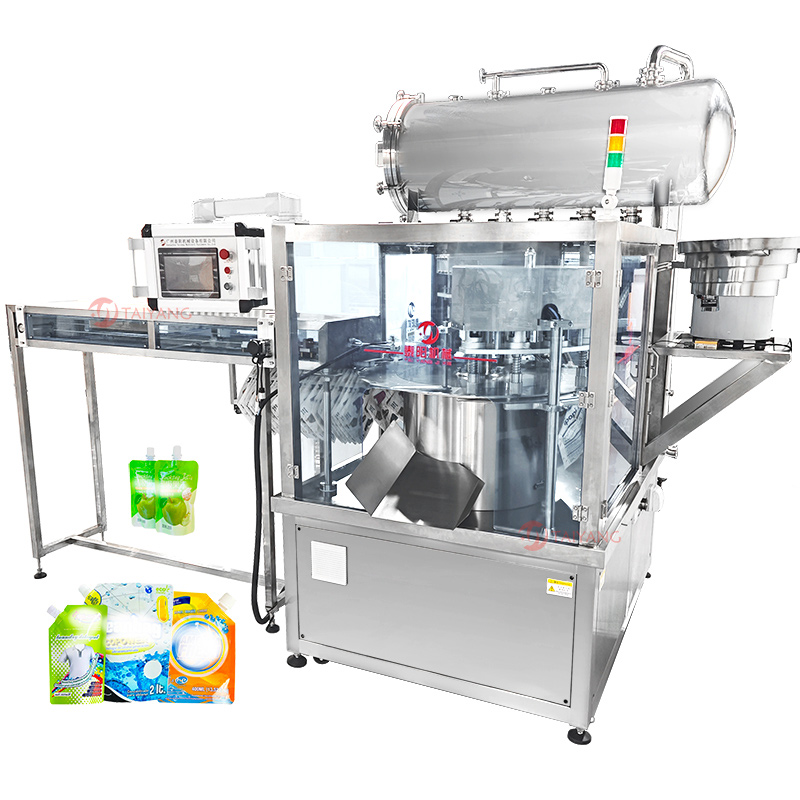 Tá an meaisín líonta málaí agus uasteorannú ceithre cheann de na taiyang seo deartha le haghaidh málaí féin-tacaíochta agus málaí spout. self-supporting bags/spoot bags with different capacity requirements can be accurately filled, whether it is a thin aqueous solution or a slightly viscous liquid, it can be perfectly adapted, and in terms of capping, it is seamlessly connected with the filling process.,Taiyang Four-head Spout Bag Filling and Capping Machine cooperates with the feeding machine to quickly lower the cap and tighten the cap firmly, effectively a chinntiú go ndéantar an mála a shéalú agus sceitheadh leachtach a chosc.
