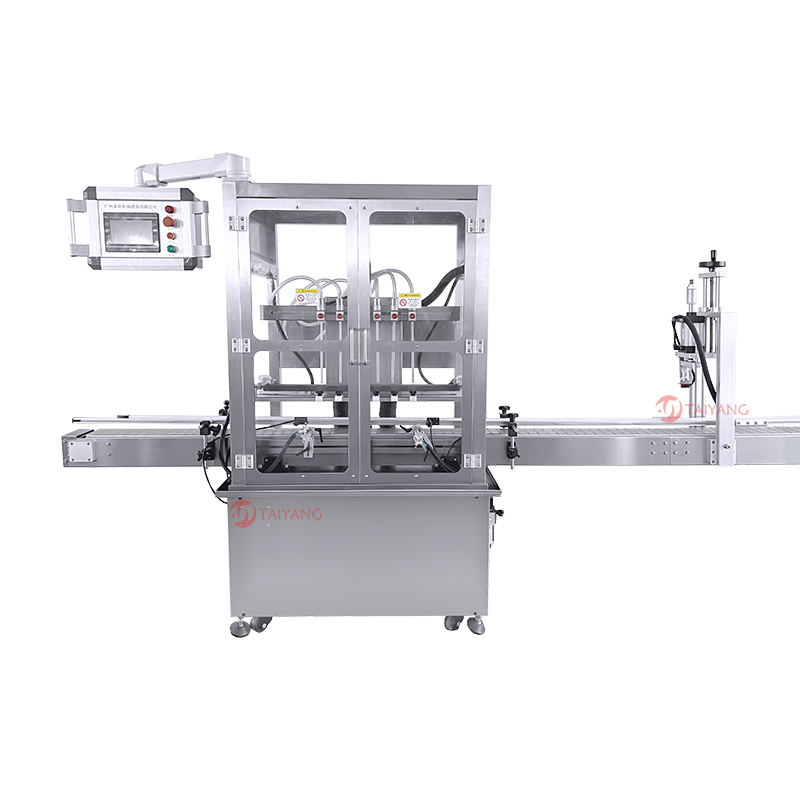 Tá sé cinn líonta ag an meaisín líonta agus uasteorannú leacht agus uasteorannú Taiyang seo, ar féidir leo oibríochtaí líonta éifeachtúla a bhaint amach, atá oiriúnach go háirithe chun uisce leachtach a líonadh, tuaslagóirí cúir ard. Tá na tréithe a bhaineann le luas tapa freagartha agus cruinneas ard. Is féidir leis an meaisín líonta agus uasteorannú leacht agus uasteorannú Taiyang seo an próiseas líonta a rialú go solúbtha, cobhsaíocht agus cruinneas an phróisis líonta a chinntiú, agus is féidir leis coimeádáin de shonraíochtaí acmhainne éagsúla a líonadh go cruinn. Sa chuid uasteorannú, oibríonn sé go dlúth leis an bpróiseas líonta.
